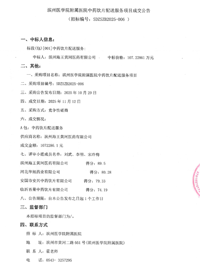 【滨州医学院附属医院】山东省滨州医学院附属医院中药饮片配送服务项目成交公告