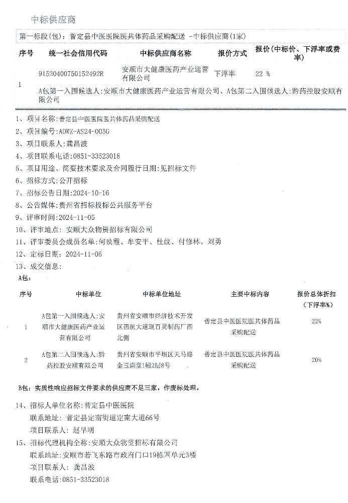 【安顺市普定县中医医院】贵州省安顺市普定县中医医院医共体药品采购配送中标结果公告