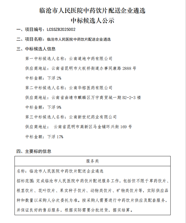 【临沧市人民医院】云南省临沧市人民医院中药饮片配送企业遴选中标候选人公示