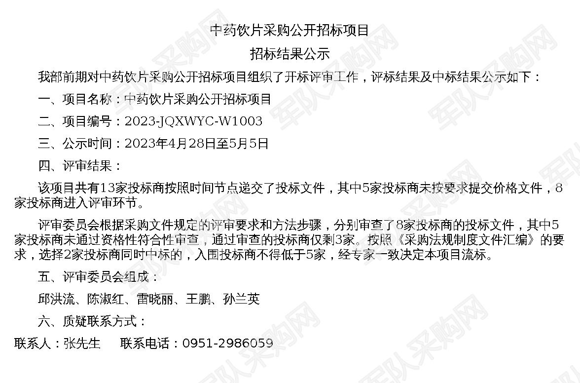 【军队采购】军队采购网中药饮片采购公开招标项目招标结果公示(2023-JQXWYC-W1003)