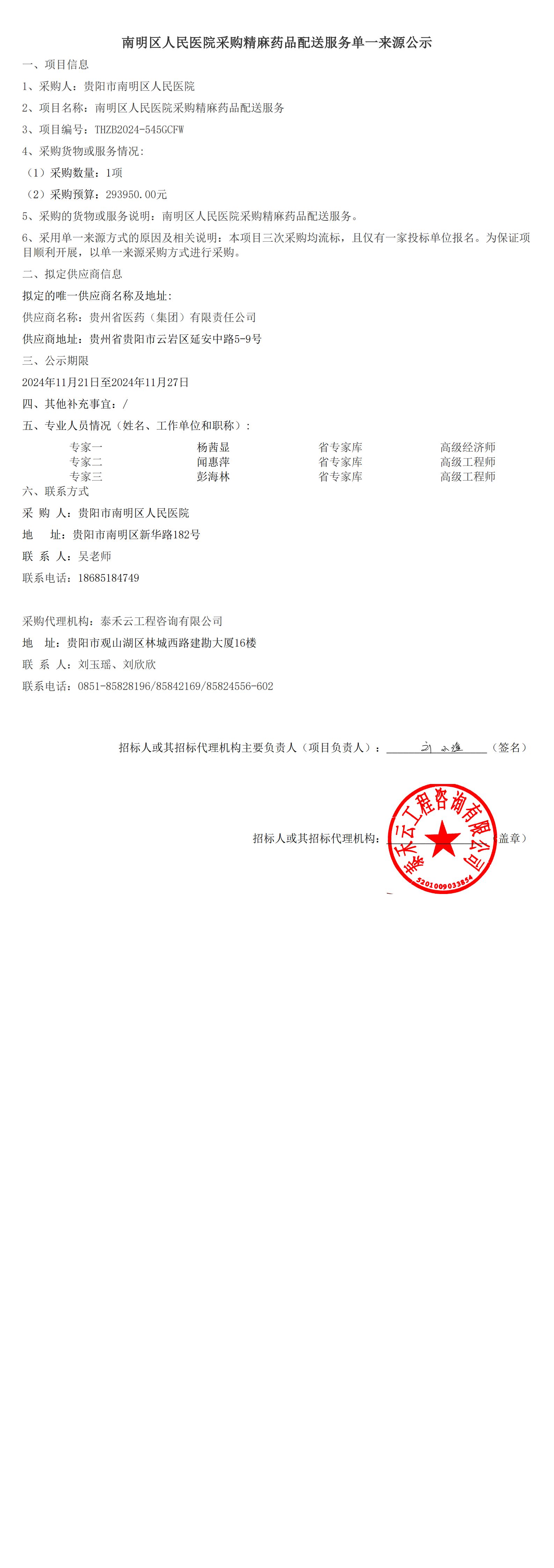 【贵阳市南明区人民医院】贵州省贵阳市南明区人民医院采购精麻药品配送服务单一来源公示