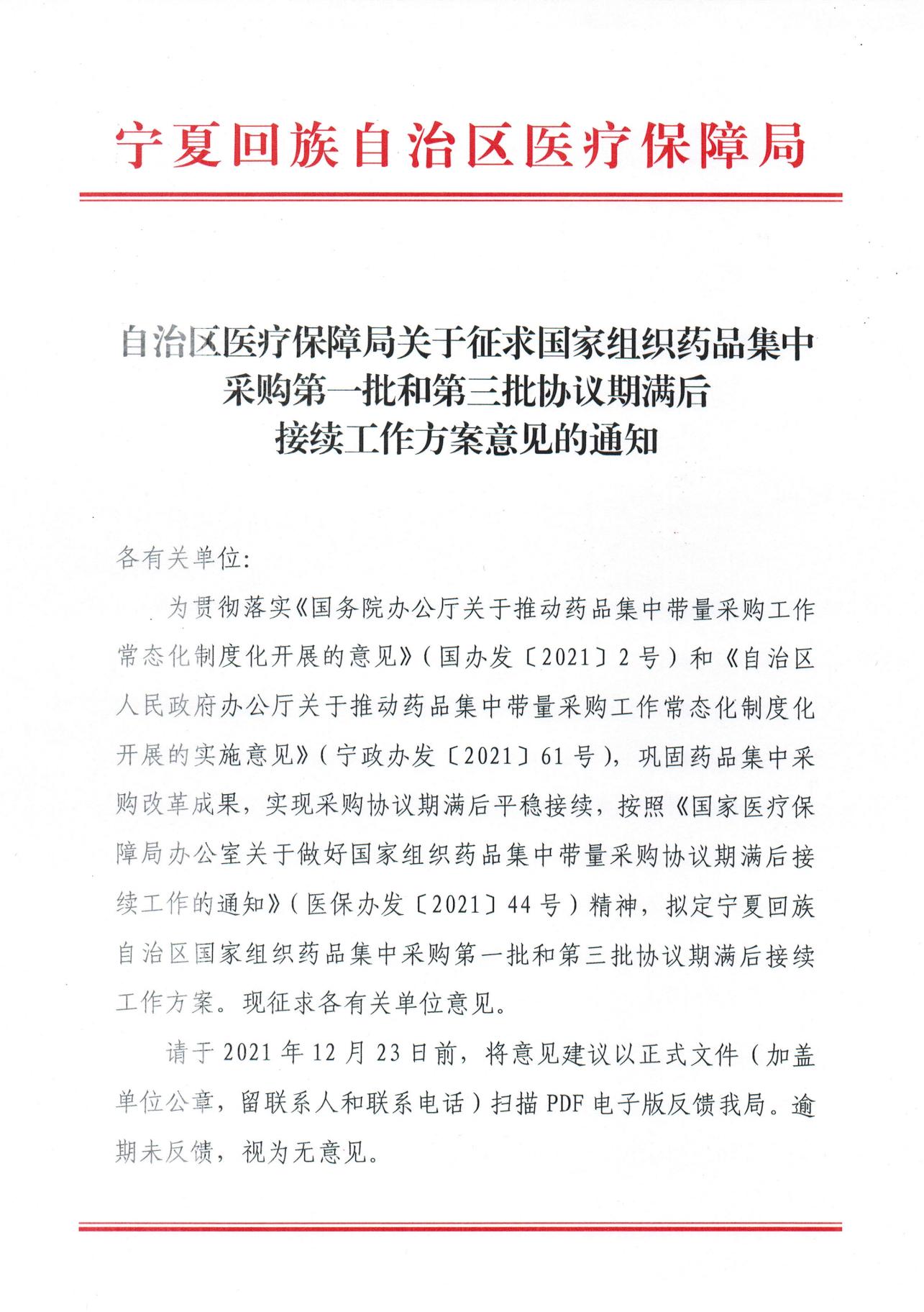 【宁夏】宁夏回族自治区关于征求国家集采第一第三批协议期满后接续工作方案意见的通知