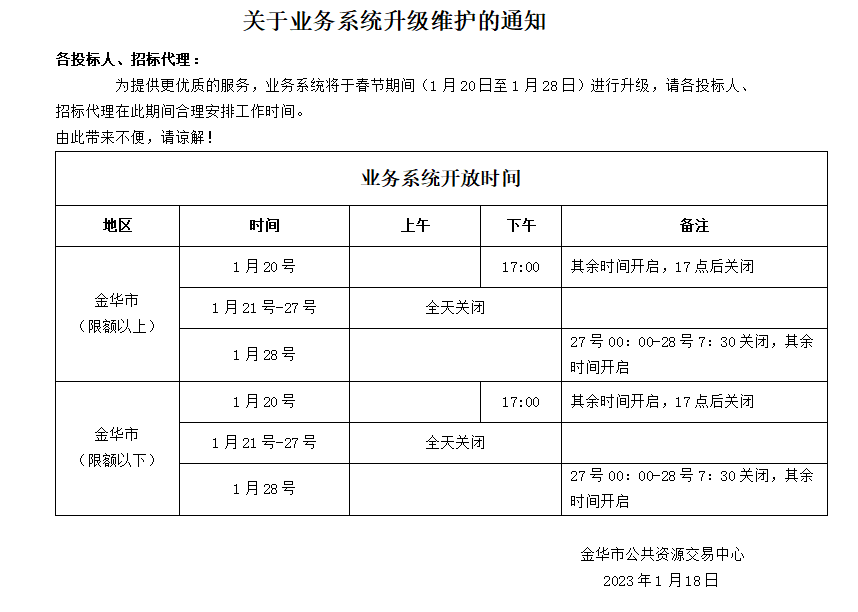 【金华】浙江省金华市公共资源交易中心关于(春节期间)业务系统升级维护的通知