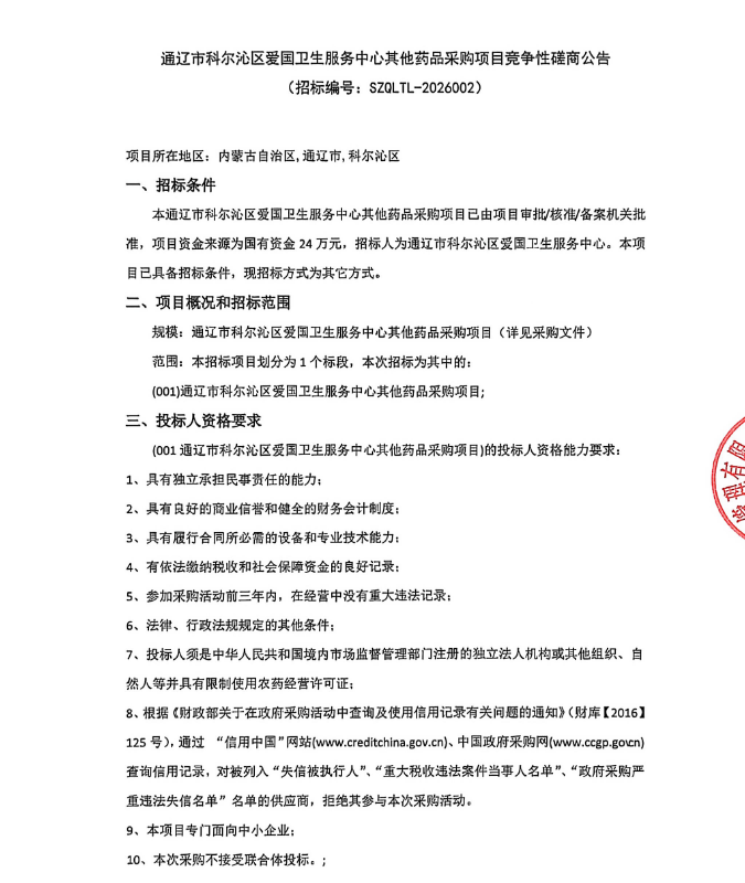 【通辽市科尔沁区爱国卫生服务中心】内蒙古自治区通辽市科尔沁区爱国卫生服务中心其他药品采购项目竞争性磋商公告