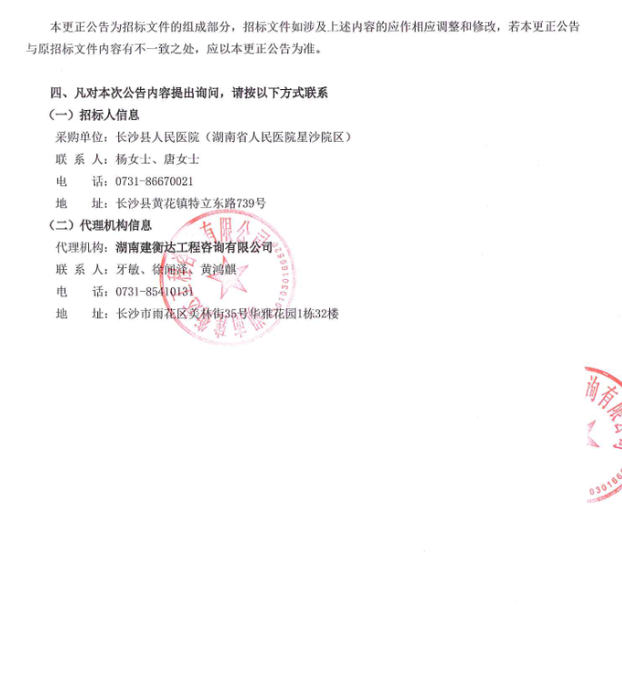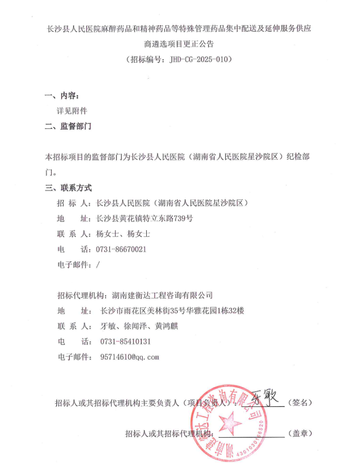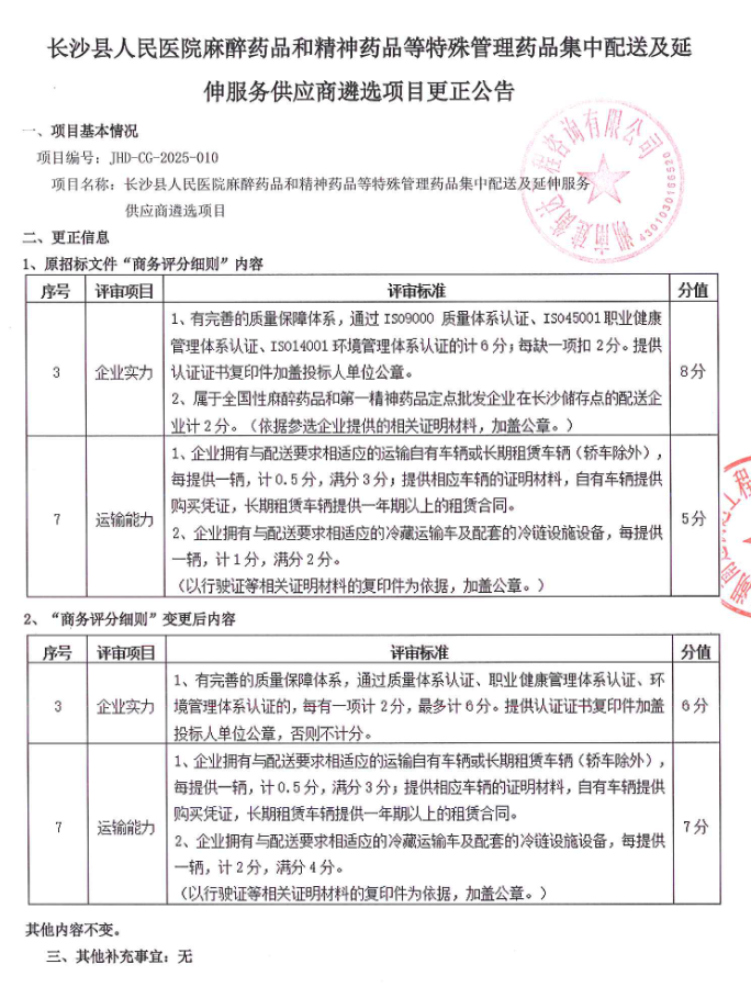 【长沙市长沙县人民医院】湖南省长沙市长沙县人民医院麻醉药品和精神药品等特殊管理药品集中配送及延伸服务供应商遴选项目更正公告