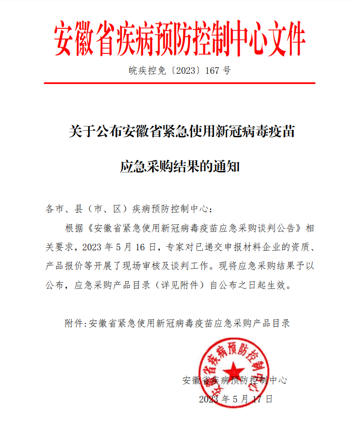 根据《安徽省紧急使用新冠病毒疫苗应急采购谈判公告》相关要求,2023年5月16日,专家对已递交申报材料企业的资质、产品报价等开展了现场审核及谈判工作。现将应急采购结果予以公布,应急采购产品目录(详见附件)自公布之日起生效。