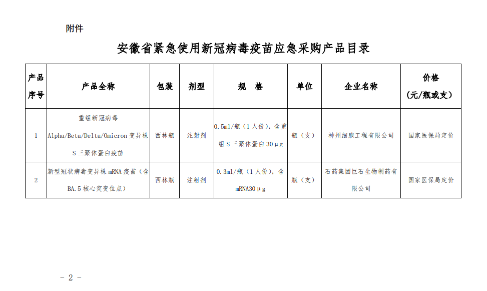 附件:安徽省紧急使用新冠病毒疫苗应急采购产品目录