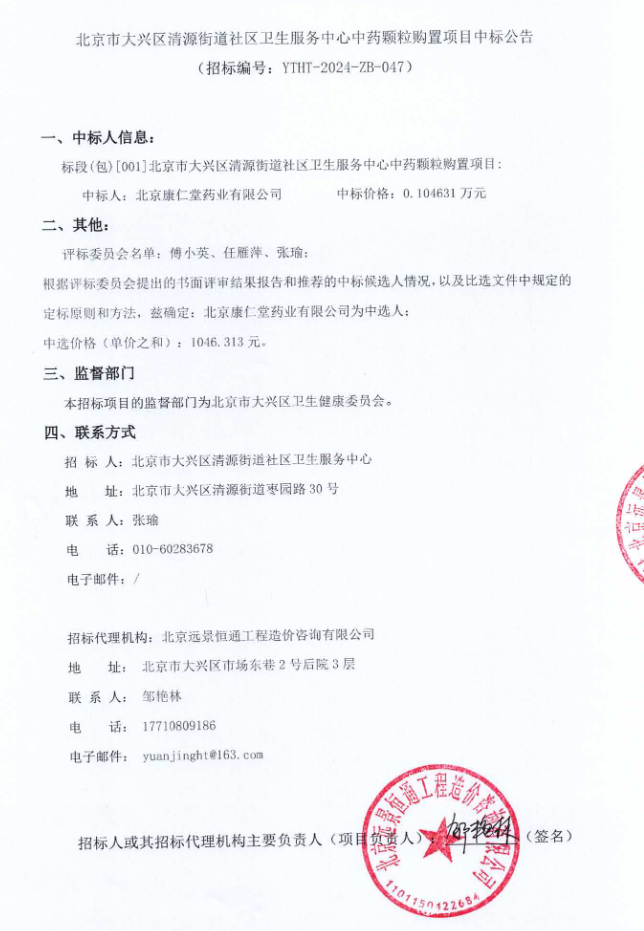 【北京市大兴区清源街道社区卫生服务中心】北京市大兴区清源街道社区卫生服务中心中药颗粒购置项目中标公告