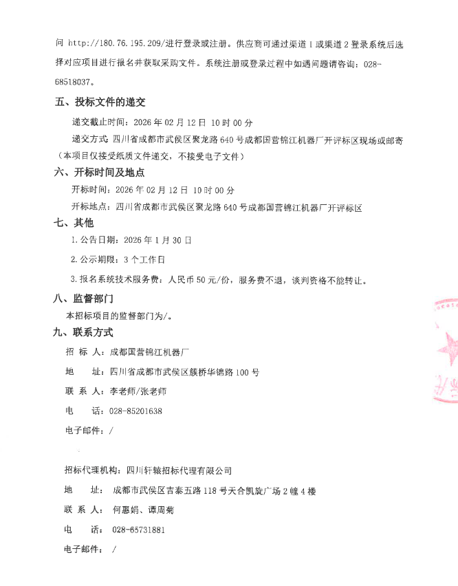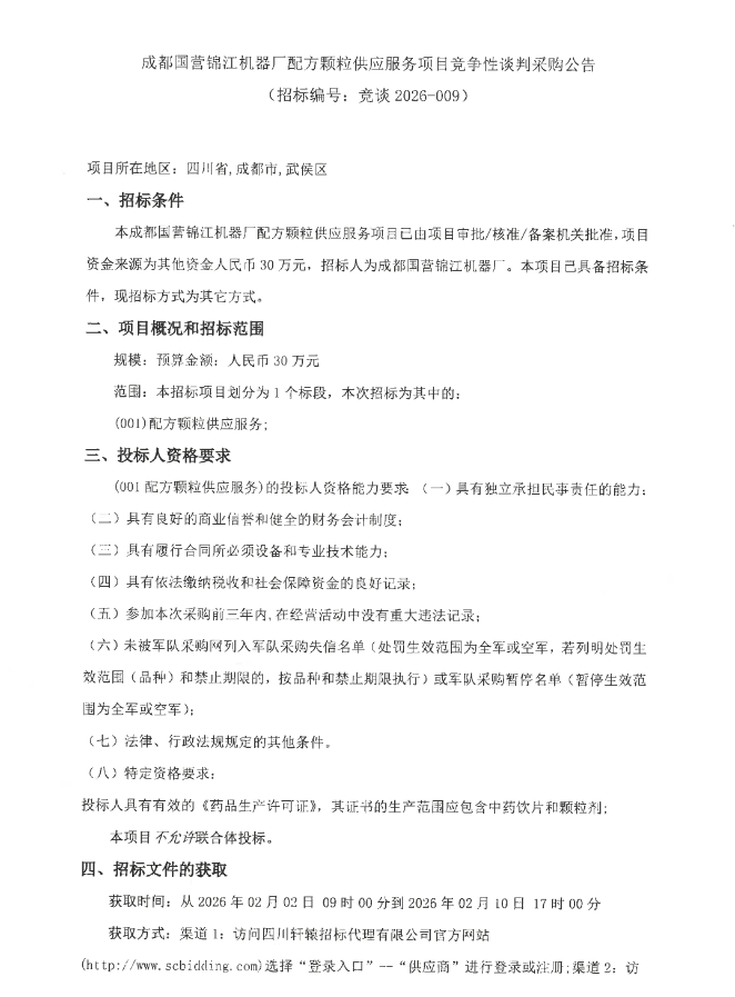 【成都国营锦江机器厂】四川省成都国营锦江机器厂配方颗粒供应服务项目竞争性谈判采购公告