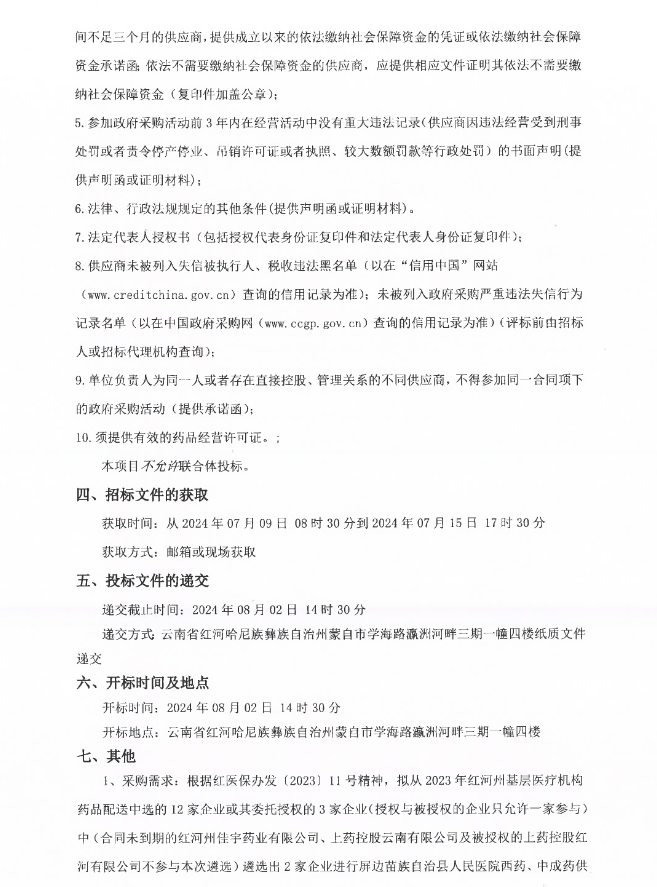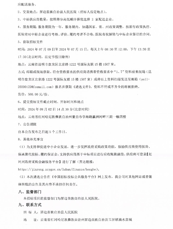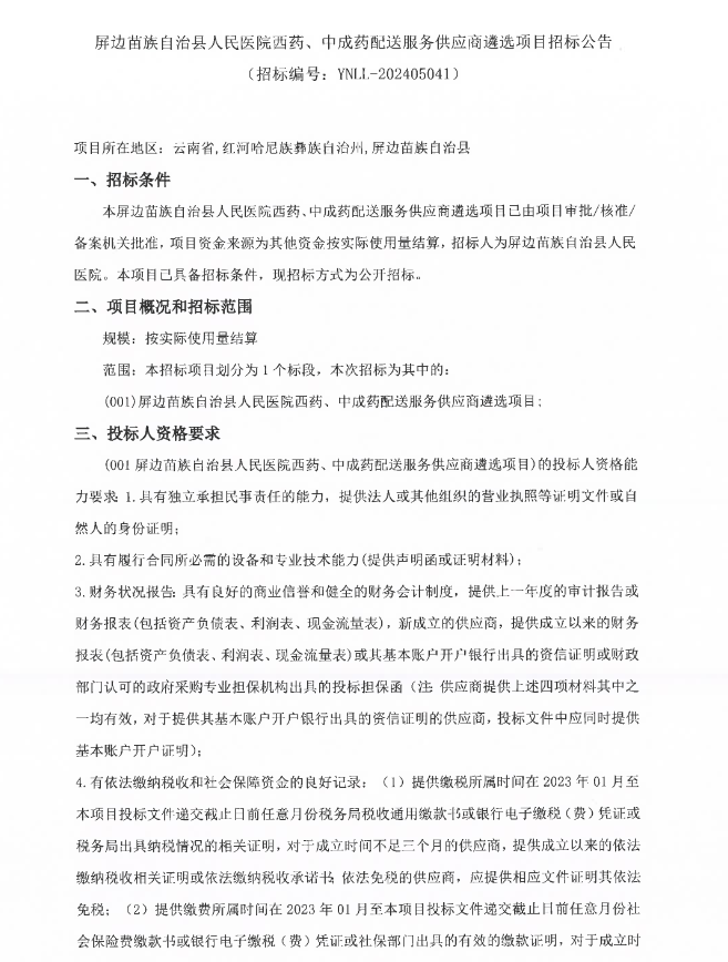 【红河哈尼族彝族自治州屏边苗族自治县人民医院】云南省红河哈尼族彝族自治州屏边苗族自治县人民医院西药、中成药配送服务供应商遴选项目招标公告