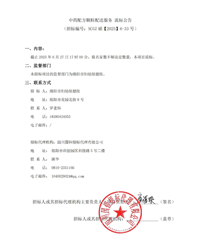 【绵阳市妇幼保健院】四川省绵阳市妇幼保健院中药配方颗粒配送服务流标公告