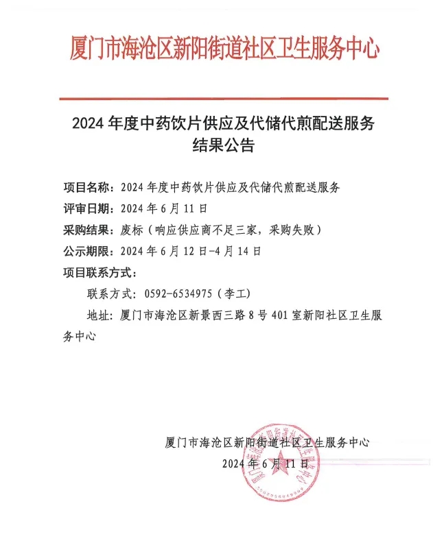 【厦门市海沧区新阳街道社区卫生服务中心】福建省厦门市海沧区新阳街道社区卫生服务中心2024年度中药饮片供应及代储代煎配送服务采购结果公告