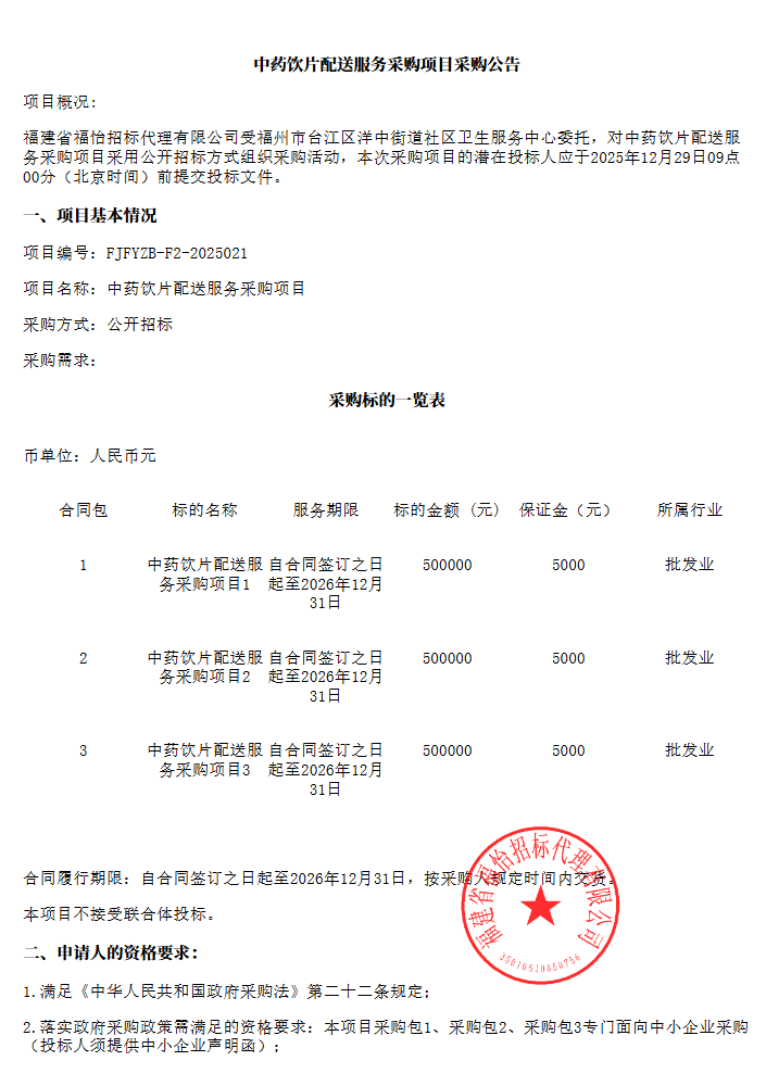 【福州市台江区洋中街道社区卫生服务中心】福建省福州市台江区洋中街道社区卫生服务中心中药饮片配送服务采购项目采购公告