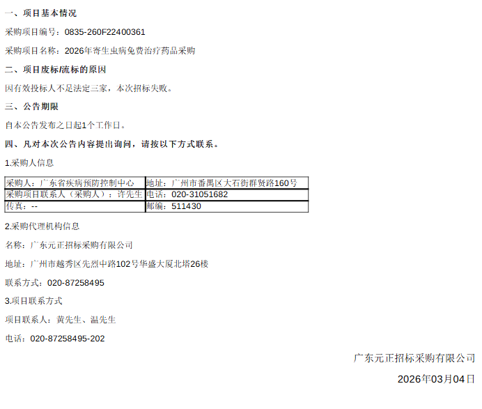 【广东省疾病预防控制中心】广东省疾病预防控制中心2026年寄生虫病免费治疗药品采购(项目编号:0835-260F22400361)废标公告