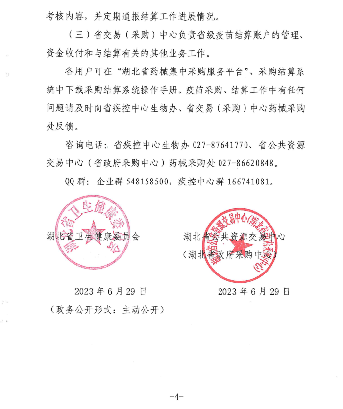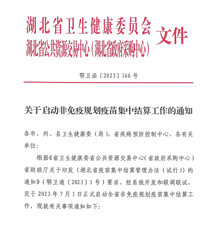 根据《省卫生健康委省公共资源交易中心(省政府采购中心)省财政厅关于印发〈湖北省疫苗集中结算管理办法(试行)〉的通知》(鄂卫通〔2023〕1号)要求,经系统开发和联调联试,定于2023年7月1日正式启动全省非免疫规划疫苗集中结算工作,现就有关事项通知如下: