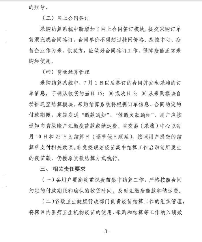 (三)省交易(采购)中心负责省级疫苗结算账户的管理、资金收付和与结算有关的其他业务工作。