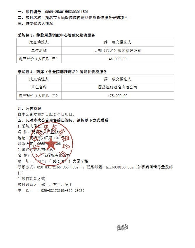 【茂名市人民医院院】广东省茂名市人民医院院内药品物流延伸服务采购项目(0809-25401MMC303011501)采购包3、采购包4成交候选人公示