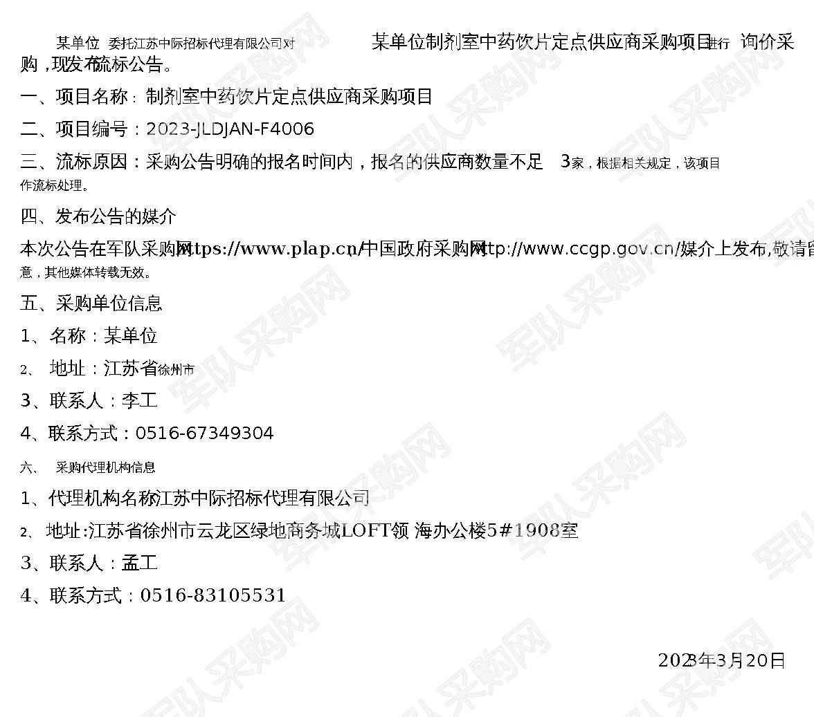 【军队采购】军队采购网某单位制剂室中药饮片定点供应商采购项目流标公告(2023-JLDJAN-F4006)