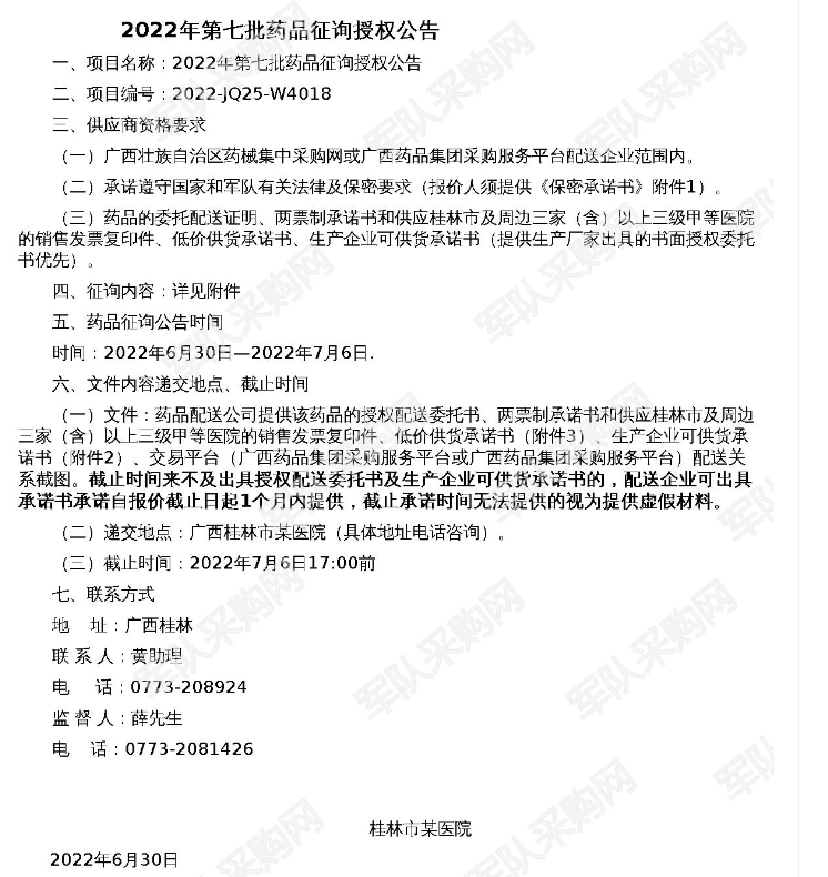 【某医院】2022年第七批药品征询授权公告(2022-JQ25-W4018)