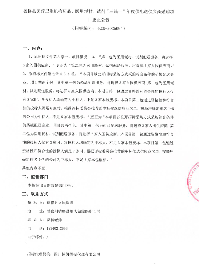 【甘孜藏族自治州德格县人民医院】四川省甘孜藏族自治州德格县医疗卫生机构药品、医用耗材、试剂“三统一”年度供配送供应商采购项目更正公告(20250710)