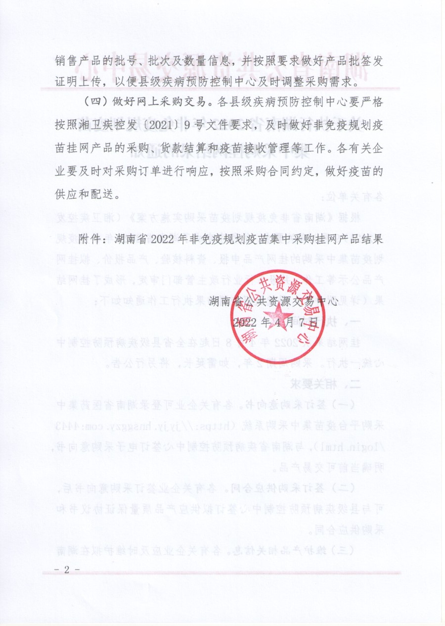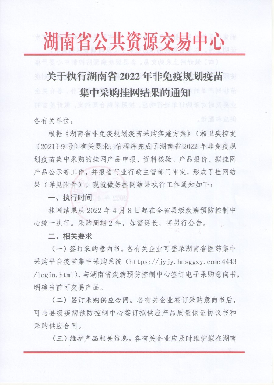 【湖南】关于执行湖南省2022年非免疫规划疫苗集中采购挂网结果的通知