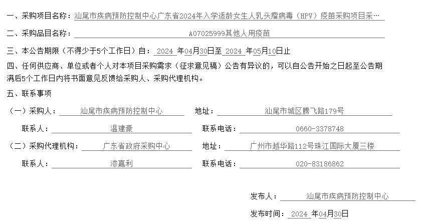 【汕尾市疾病预防控制中心】广东省汕尾市疾病预防控制中心广东省2024年入学适龄女生人乳头瘤病毒(HPV)疫苗采购项目采购需求征求意见公告
