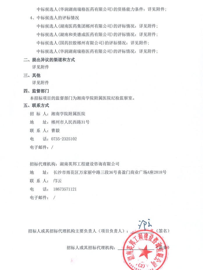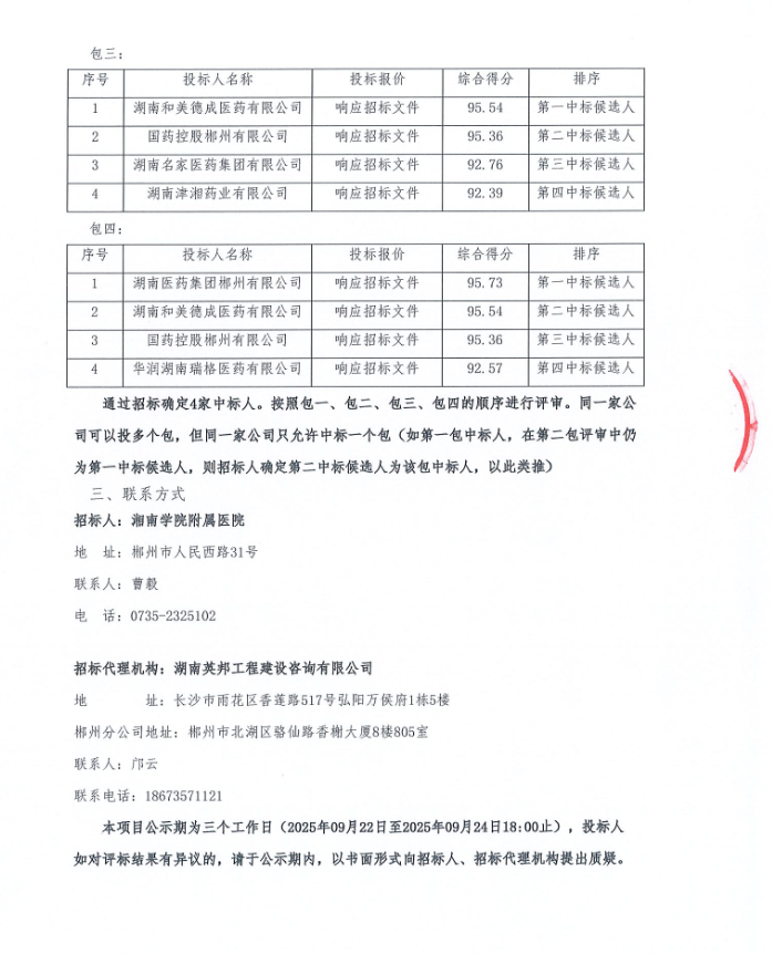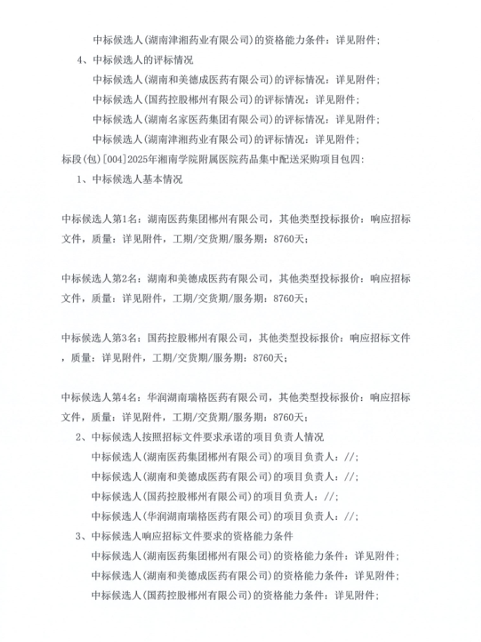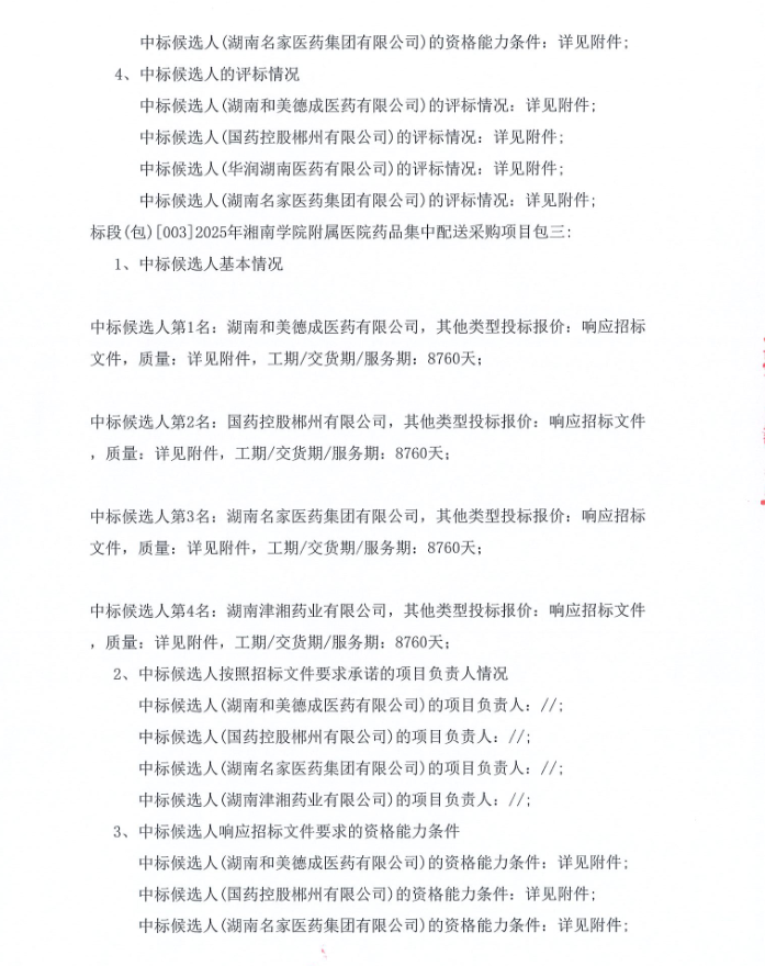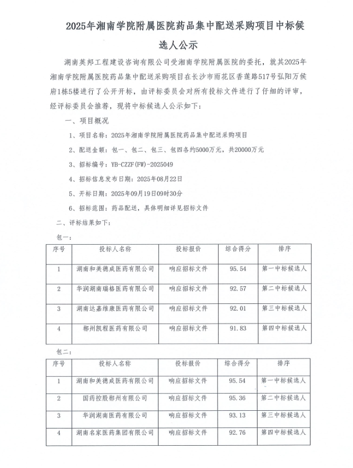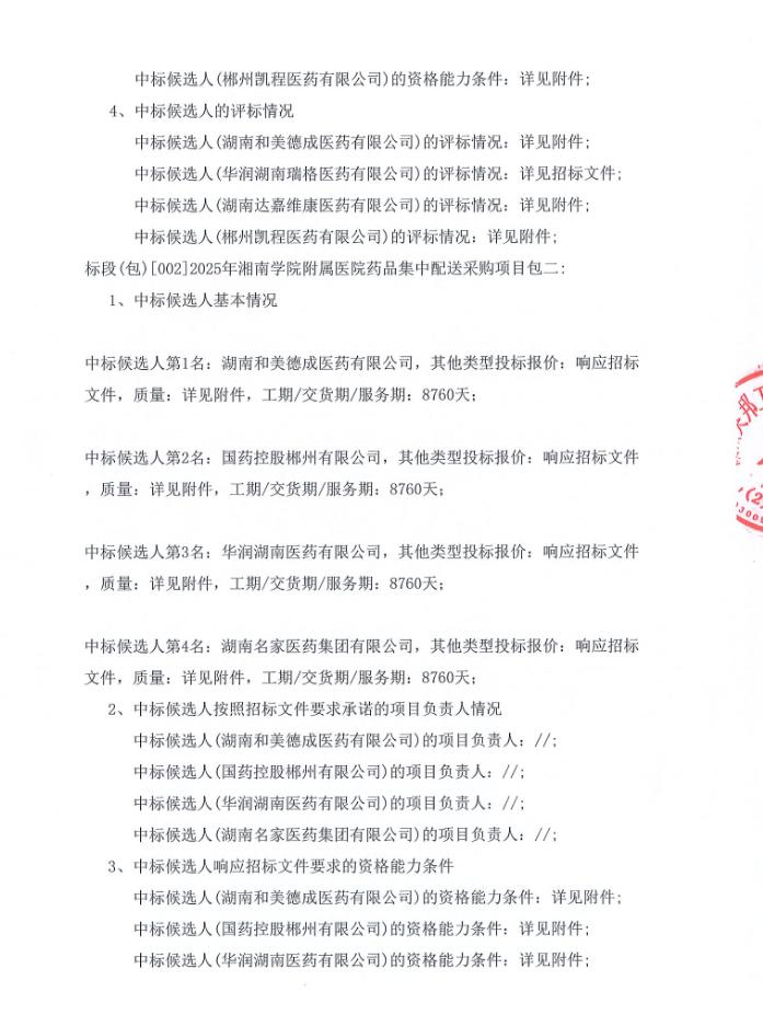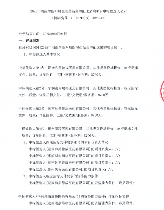 【郴州市湘南学院附属医院】湖南省2025年湘南学院附属医院药品集中配送采购项目中标候选人公示