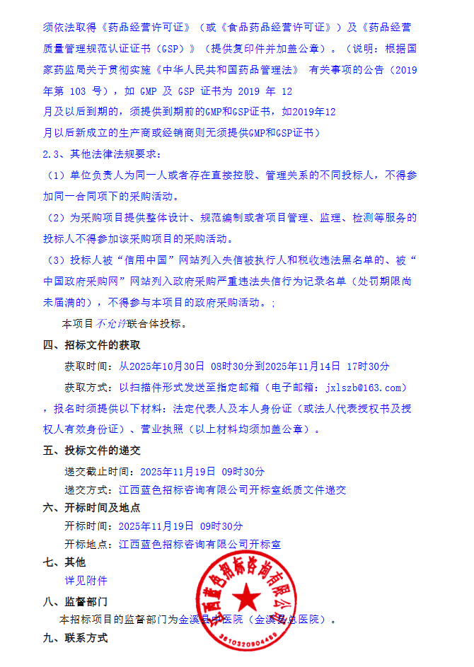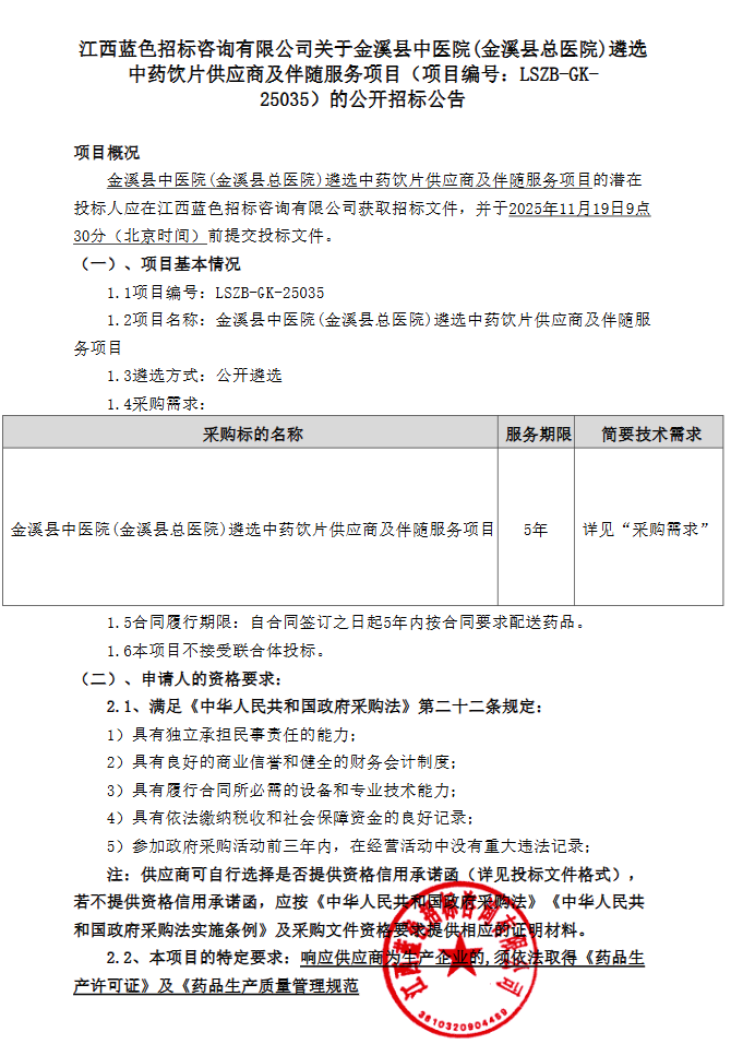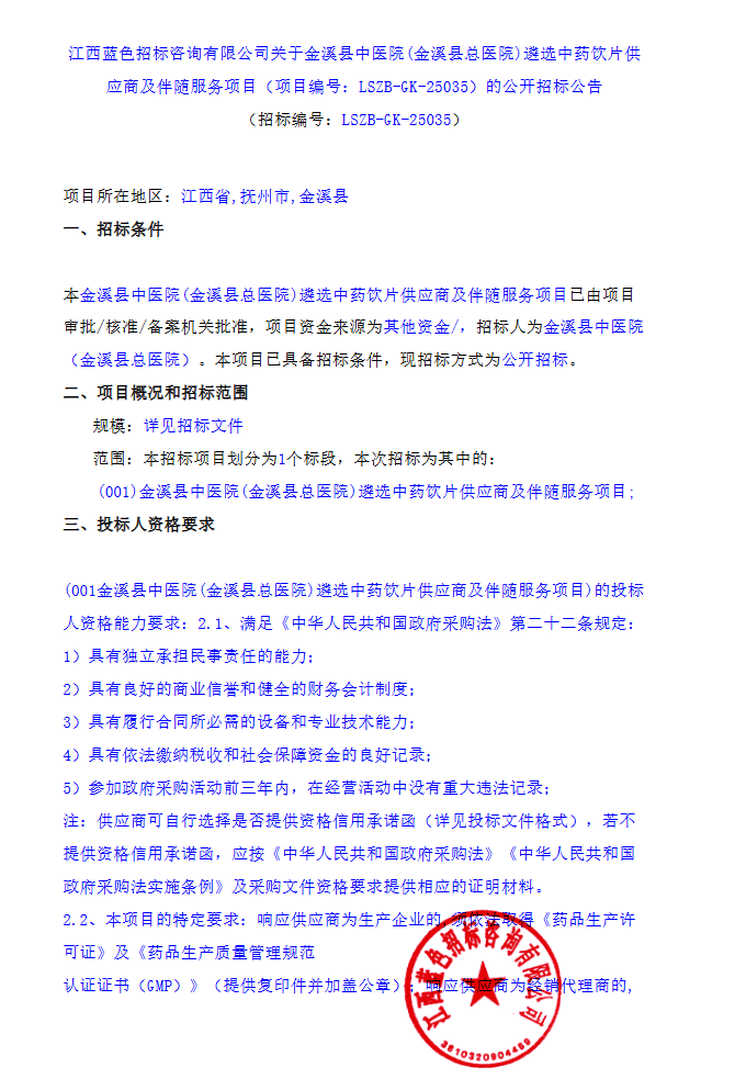 【抚州市金溪县中医院】江西蓝色招标咨询有限公司关于金溪县中医院(金溪县总医院)遴选中药饮片供应商及伴随服务项目(项目编号:LSZB-GK-25035)的公开招标公告