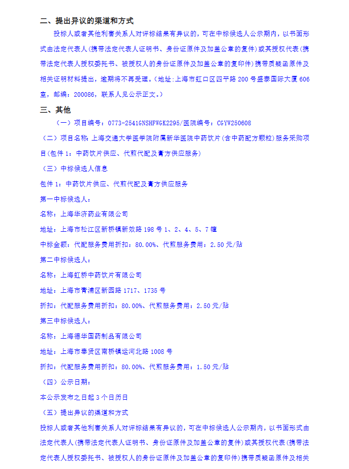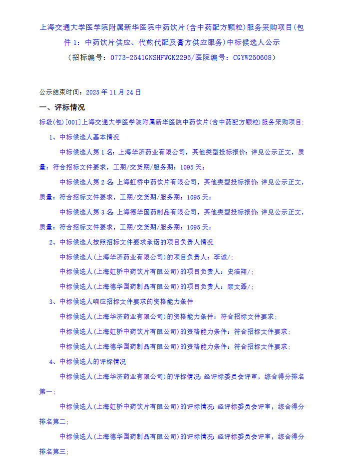 【上海交通大学医学院附属新华医院】上海交通大学医学院附属新华医院中药饮片(含中药配方颗粒)服务采购项目(包件1:中药饮片供应、代煎代配及膏方供应服务)中标候选人公示