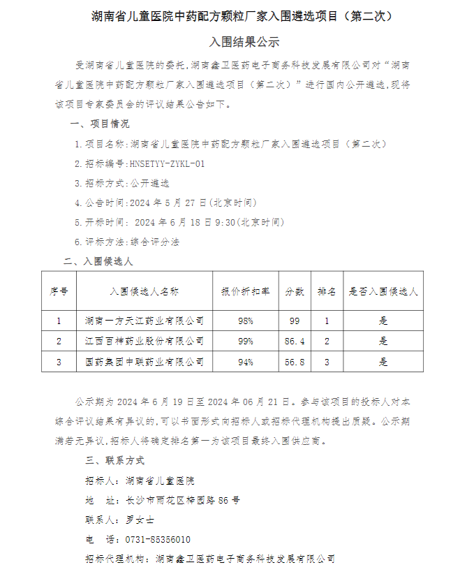 【湖南省儿童医院】湖南省儿童医院中药配方颗粒厂家入围遴选项目(第二次)结果公示