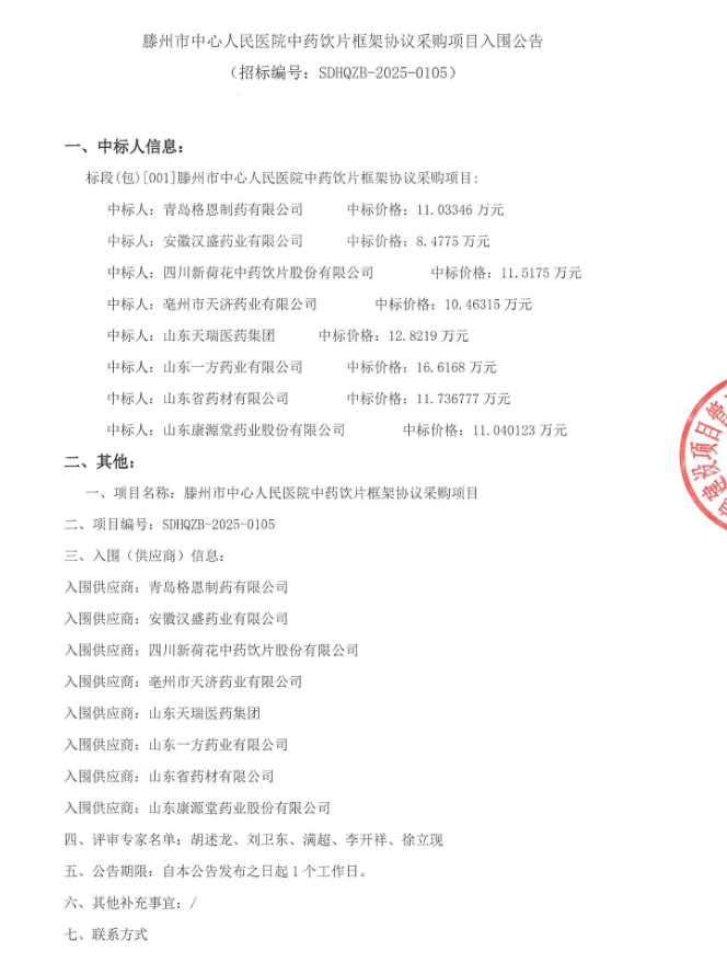 【枣庄市滕州市中心人民医院】山东省滕州市中心人民医院中药饮片框架协议采购项目入围公告