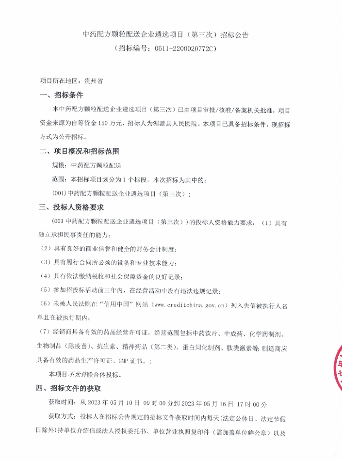 【遵义市湄潭县人民医院】贵州省遵义市湄潭县人民医院中药配方颗粒配送企业遴选项目(第三次)招标公告