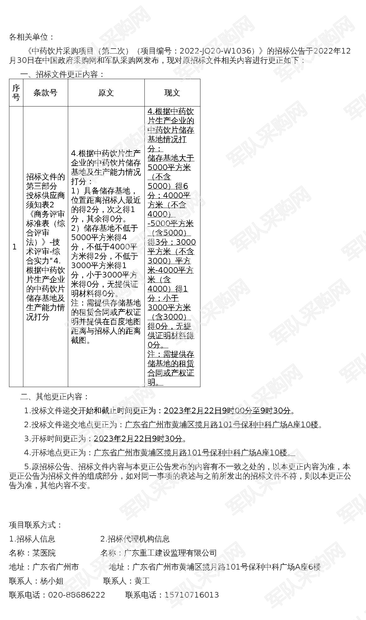 【军队采购】军队采购网中药饮片采购项目(第二次)的更正公告(项目编号:2022-JQ20-W1036)