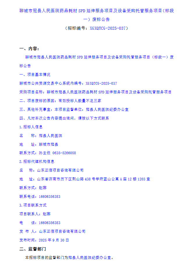 【聊城市冠县人民医院】山东省聊城市冠县人民医院药品耗材SPD延伸服务项目及设备采购托管服务项目(标段一)废标公告