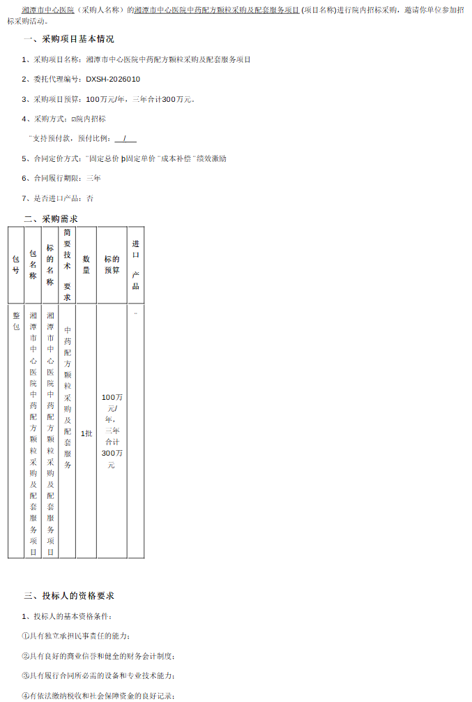 【湘潭市中心医院】湖南省湘潭市中心医院中药配方颗粒采购及配套服务项目院内招标公告
