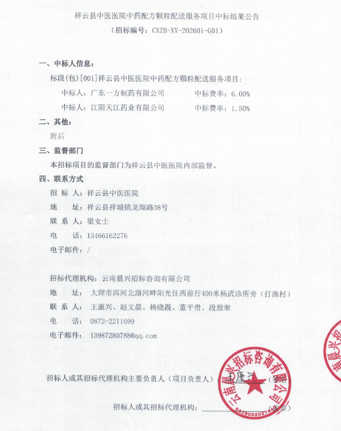 【大理白族自治州祥云县中医医院】云南省大理白族自治州祥云县中医医院中药配方颗粒配送服务项目中标结果公告