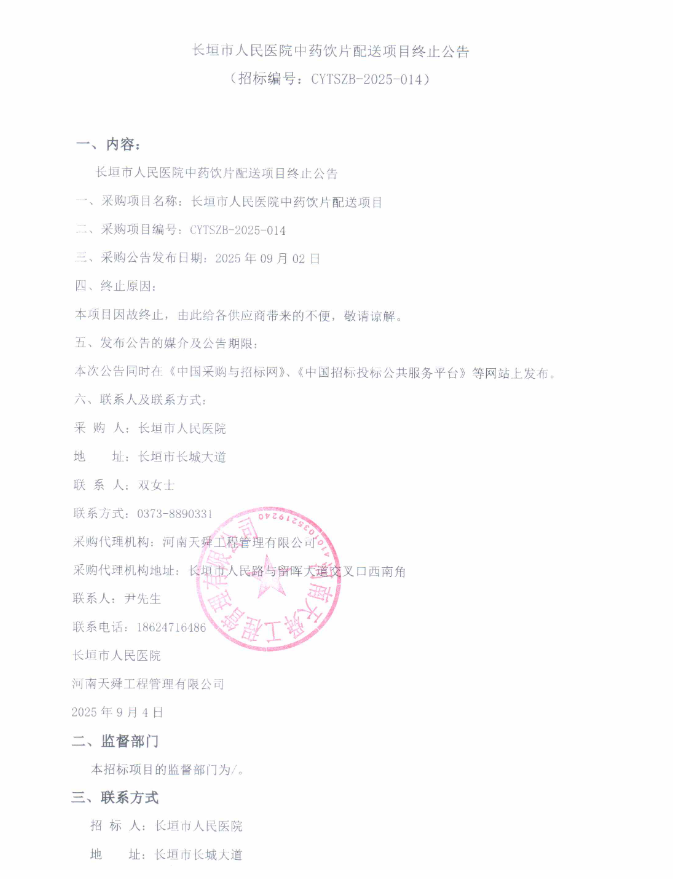 【新乡市长垣市人民医院】河南省长垣市人民医院中药饮片配送项目终止公告