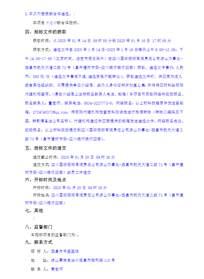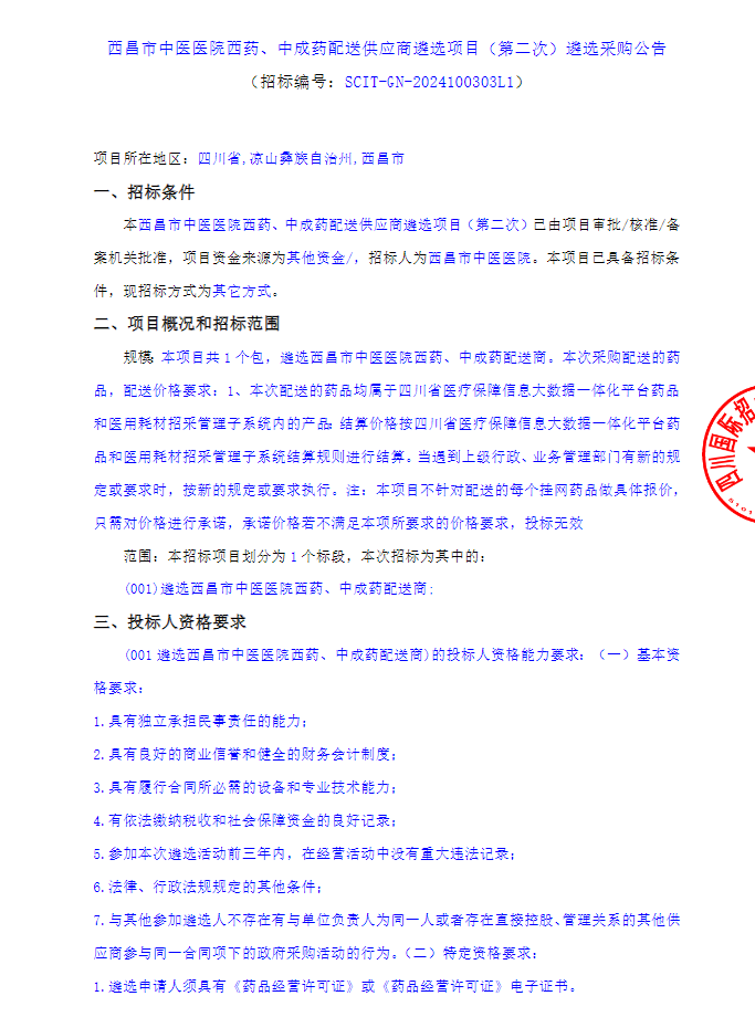 【凉山彝族自治州西昌市中医医院】四川省凉山彝族自治州西昌市中医医院西药、中成药配送供应商遴选项目(第二次)遴选采购公告