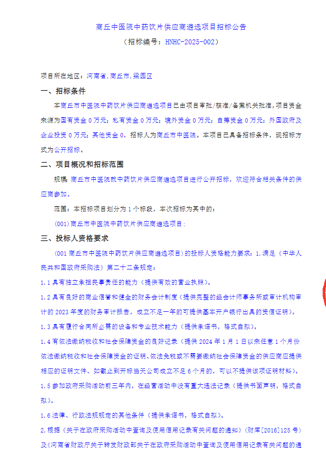 【商丘市中医院】河南省商丘中医院中药饮片供应商遴选项目招标公告