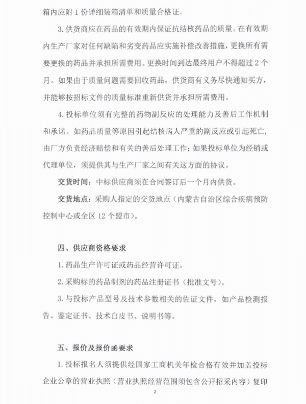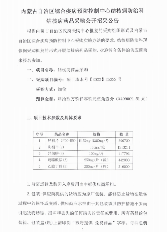 【内蒙古自治区综合疾病预防控制中心】内蒙古自治区内蒙古综合疾控中心结核病防治科结核病药品采购公开招采公告