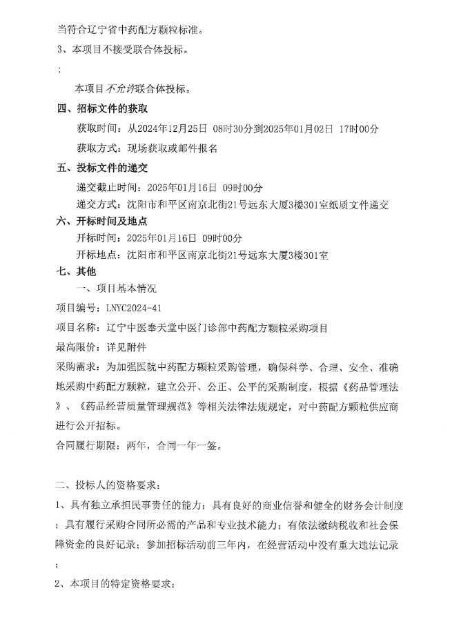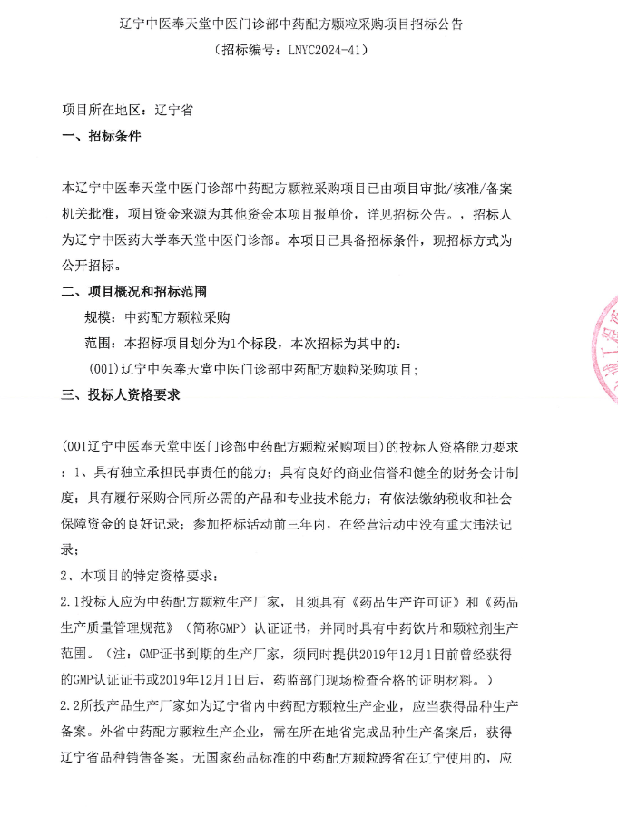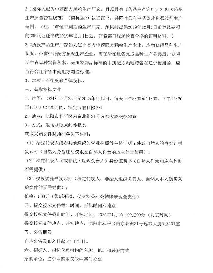 【辽宁中医奉天堂中医门诊部】辽宁中医奉天堂中医门诊部中药配方颗粒采购项目招标公告(20241225)