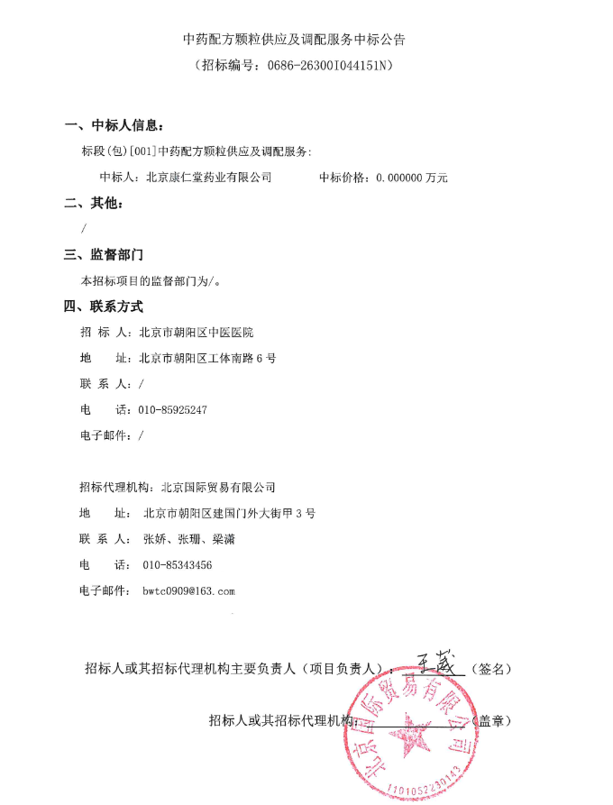 【北京市朝阳区中医医院】北京市朝阳区中医医院中药配方颗粒供应及调配服务中标公告