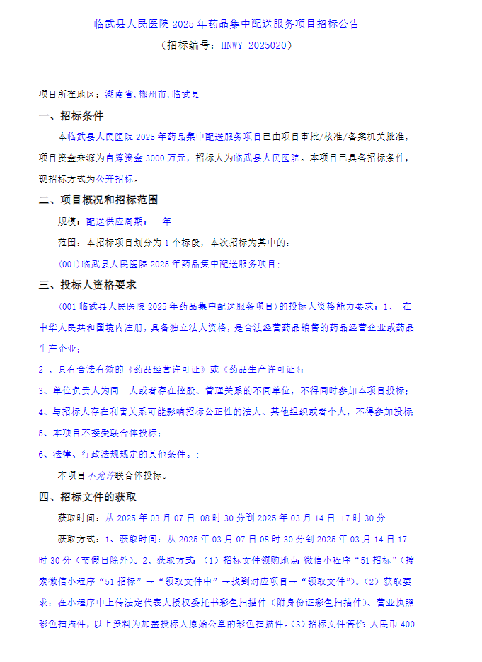 【郴州市临武县人民医院】湖南省郴州市临武县人民医院2025年药品集中配送服务项目招标公告