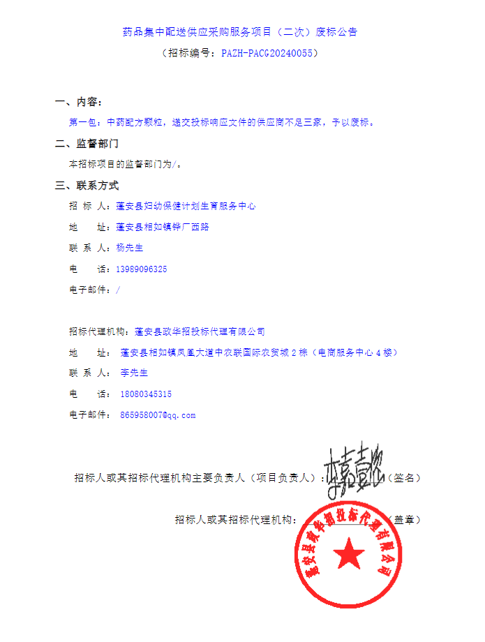 【南充市蓬安县妇幼保健计划生育服务中心】四川省南充市蓬安县妇幼保健计划生育服务中心药品集中配送供应采购服务项目(二次)废标公告