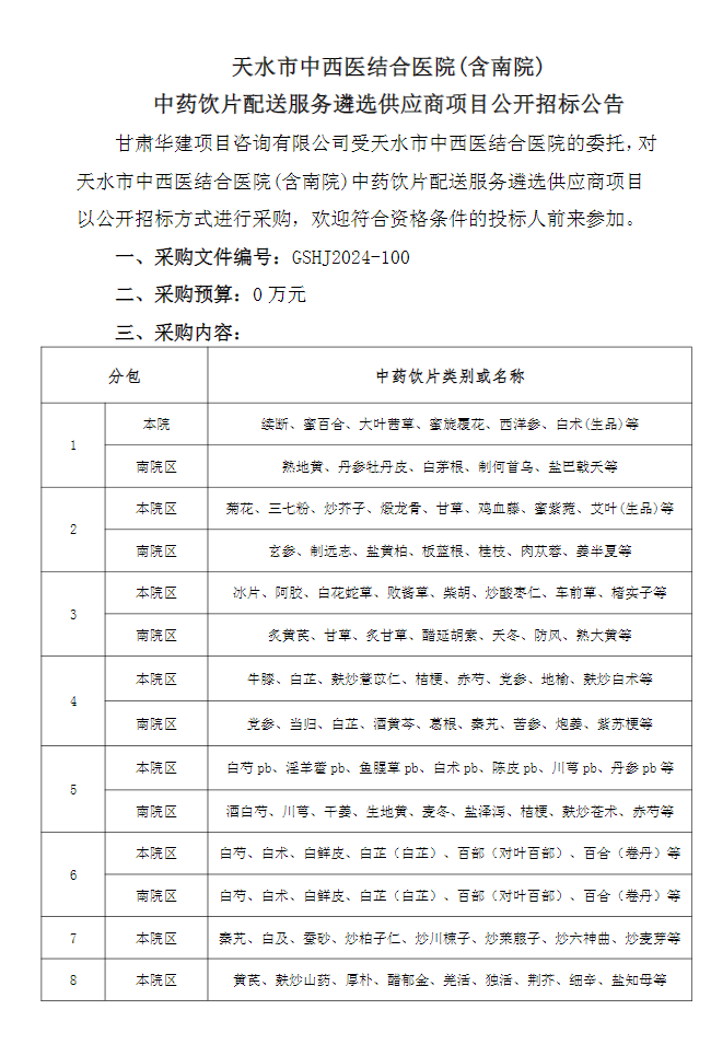 【天水市中西医结合医院】甘肃省天水市中西医结合医院(含南院)中药饮片配送服务遴选供应商项目公开招标公告