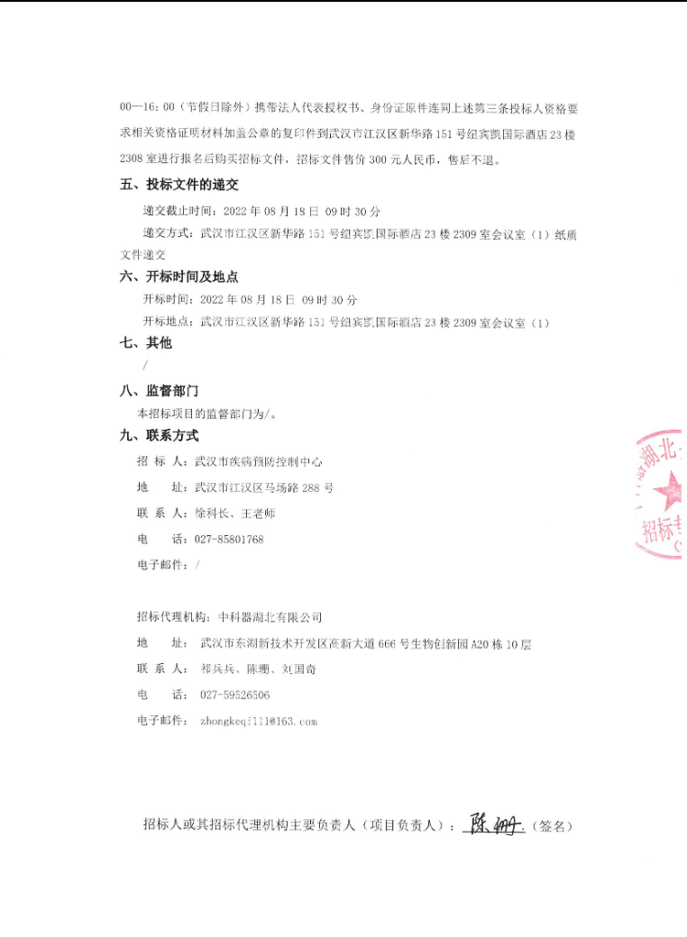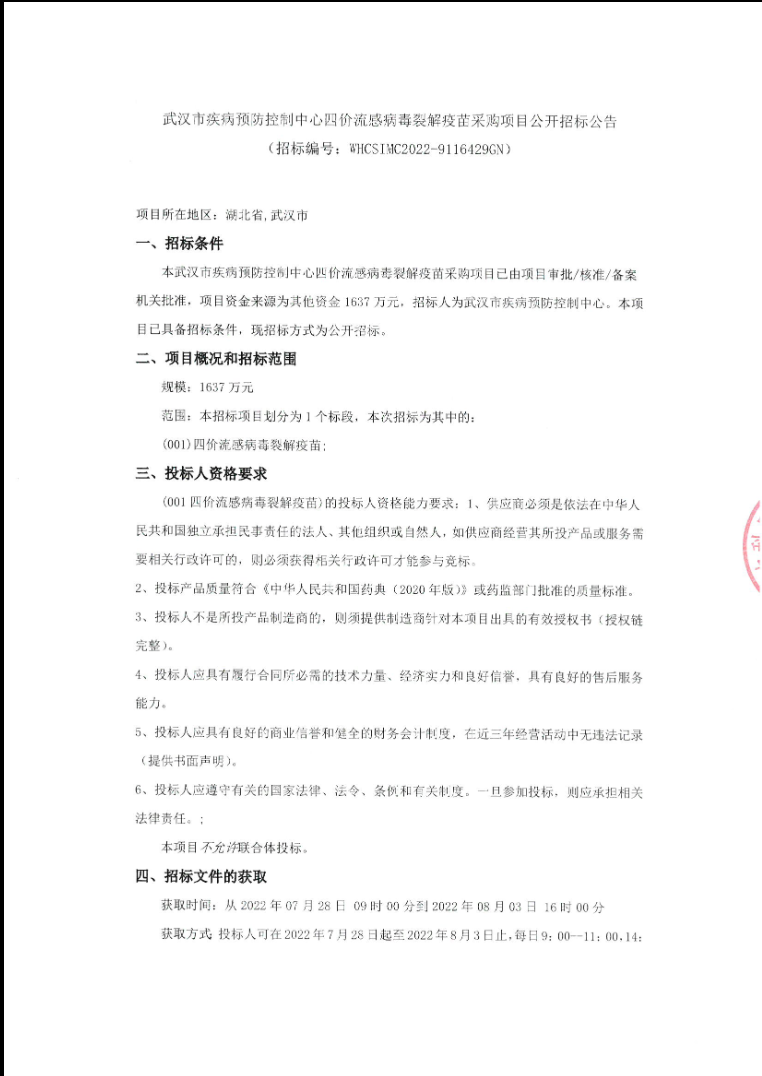 【武汉市疾病预防控制中心】湖北省武汉市疾病预防控制中心四价流感病毒裂解疫苗采购项目公开招标公告