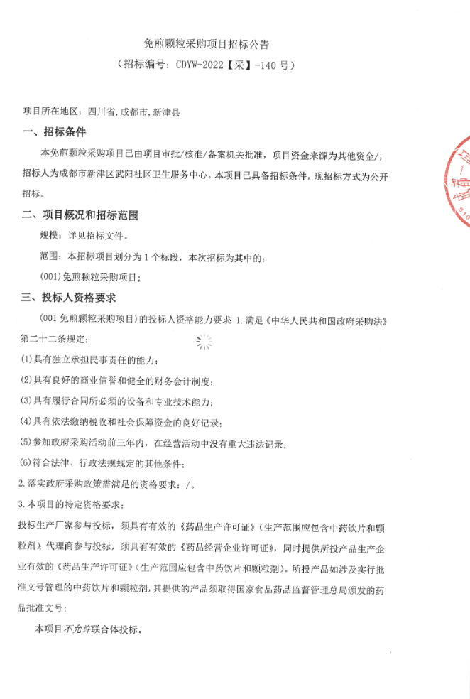 【四川省成都市新津县武阳社区服务中心】免煎颗粒采购项目更正公告