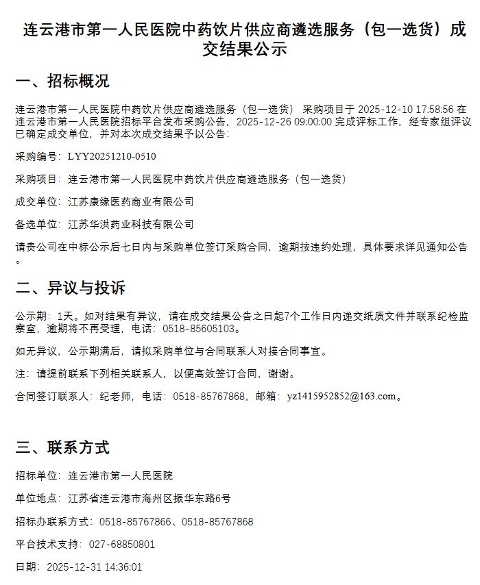【连云港市第一人民医院】江苏省连云港市第一人民医院中药饮片供应商遴选服务(包一选货)成交结果公示