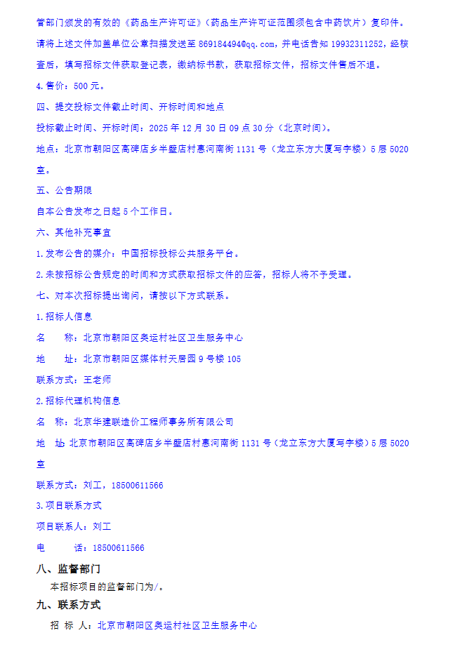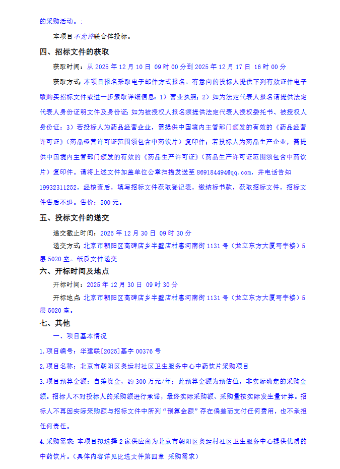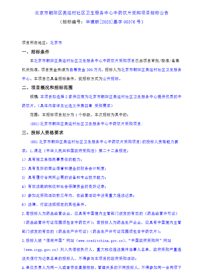 【北京市朝阳区奥运村社区卫生服务中心】北京市朝阳区奥运村社区卫生服务中心中药饮片采购项目招标公告