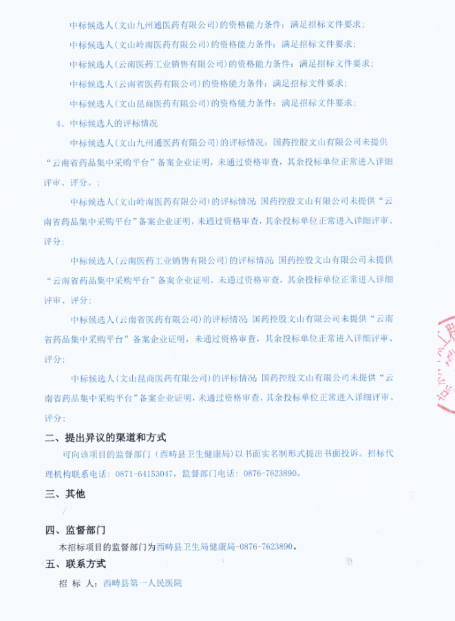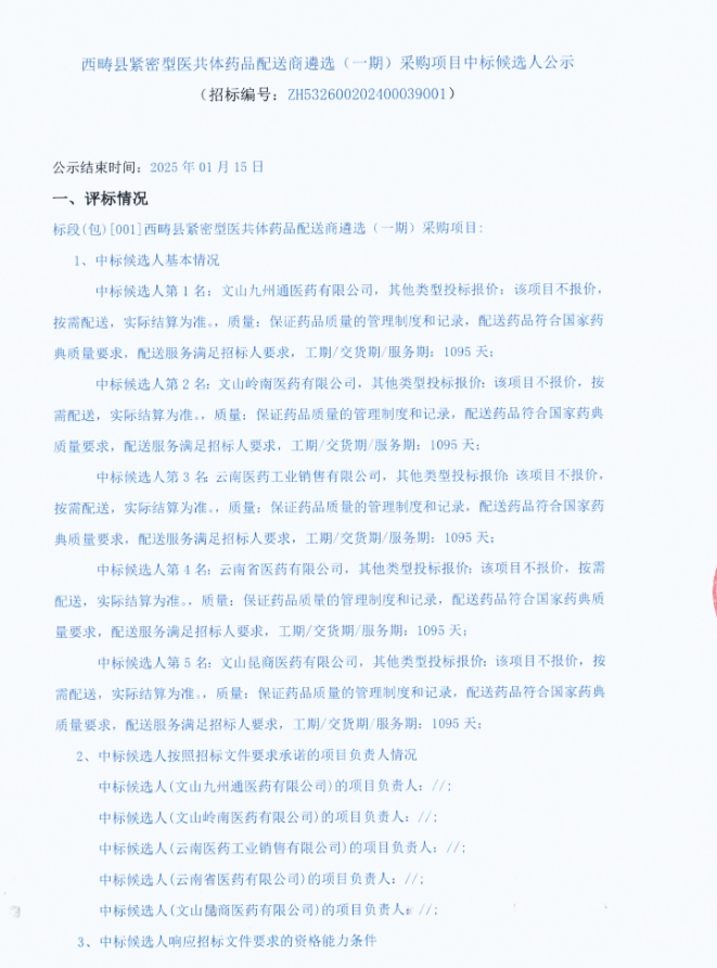 【文山壮族苗族自治州西畴县紧密型医共体总医院】云南省文山壮族苗族自治州西畴县紧密型医共体药品配送商遴选(一期)采购项目中标候选人公示